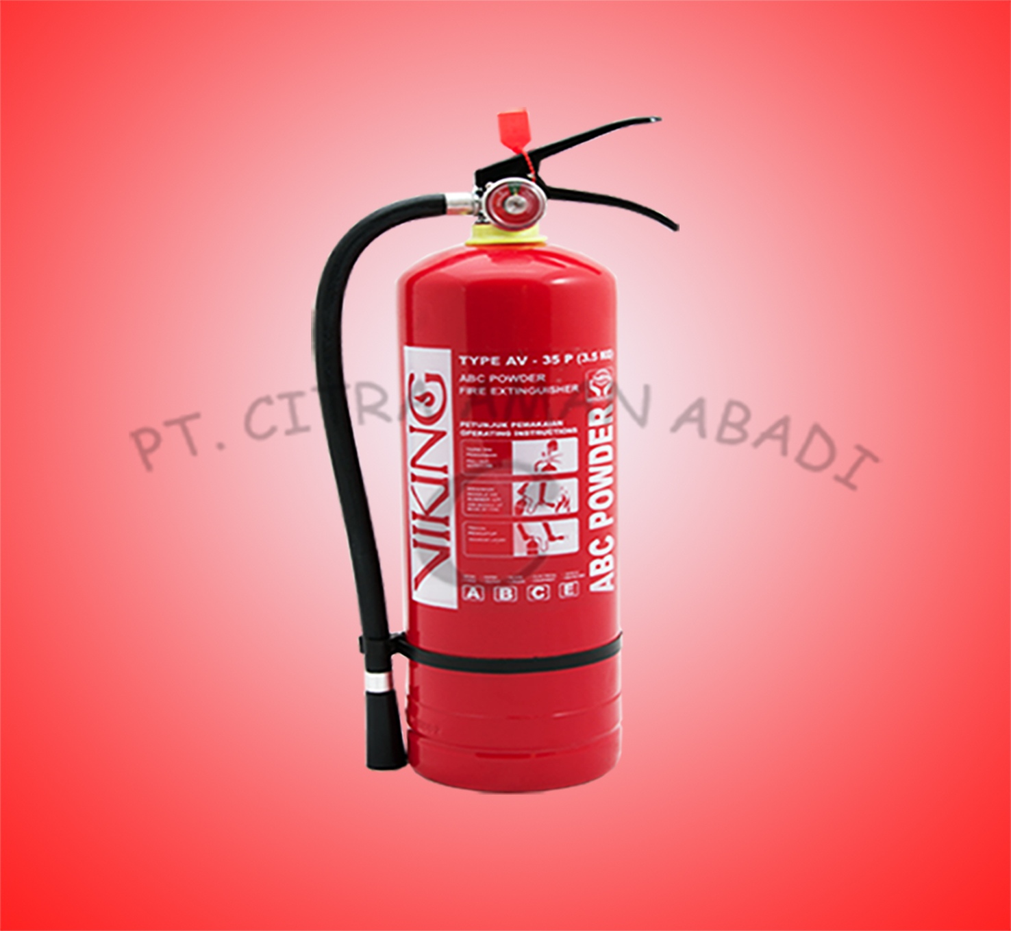 APAR / Alat Pemadam Api Ringan powder Viking type AV-35P isi bubuk powder 50% 3,5kg, dengan diameter 13cm dan tinggi tabung 42cm. Tabung pemadam Viking denga isi bubuk powder 50% sangat ampuh dalam memadamkan api, selain itu Tabung pemadam Viking dengan jenis isi bubuk powder itu merupakan tabung pemadam yang mudah untuk di gunakan. Tabung pemadam api powder Viking telah lulus uji lab dinas pemadam kebakaran sehingga secara mutu keseluruhan sangat terjamin dan sudah memenuhi syarat-syarat tabung pemadam yang layak di pasarkan dan dipasang di berbagai tempat seperti bagunan perkantoran, fasilitas umum, dan di berbagai fasilitas lainnya.Tabung pemadam kebakaran Powder Viking memiliki kelas kebakaran sebagai berikut :Kelas kebakaran A meliputi material padat dan mudah terbakar seperti kain, kertas, kayu, dllKelas kebakaran B meliputi zat yang cair dan mudah terbakar seperti bensin, solar, thinner dan cat Kelas kebakaran C meliputi elektrikal atau listrik